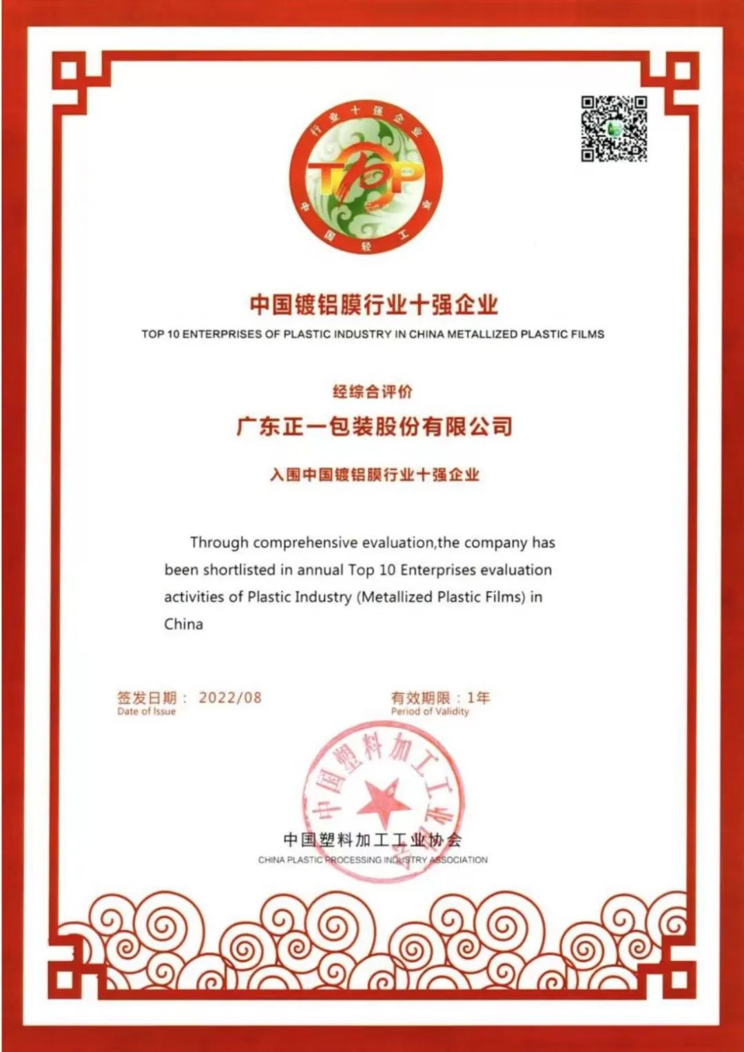 近日,中國塑料加工工業(yè)協(xié)會發(fā)布“2022年度中國鍍鋁膜行業(yè)十強(qiáng)企業(yè)”。經(jīng)綜合評價,廣東正一包裝股份有限公司入圍中國鍍鋁膜行業(yè)十強(qiáng)企業(yè)。